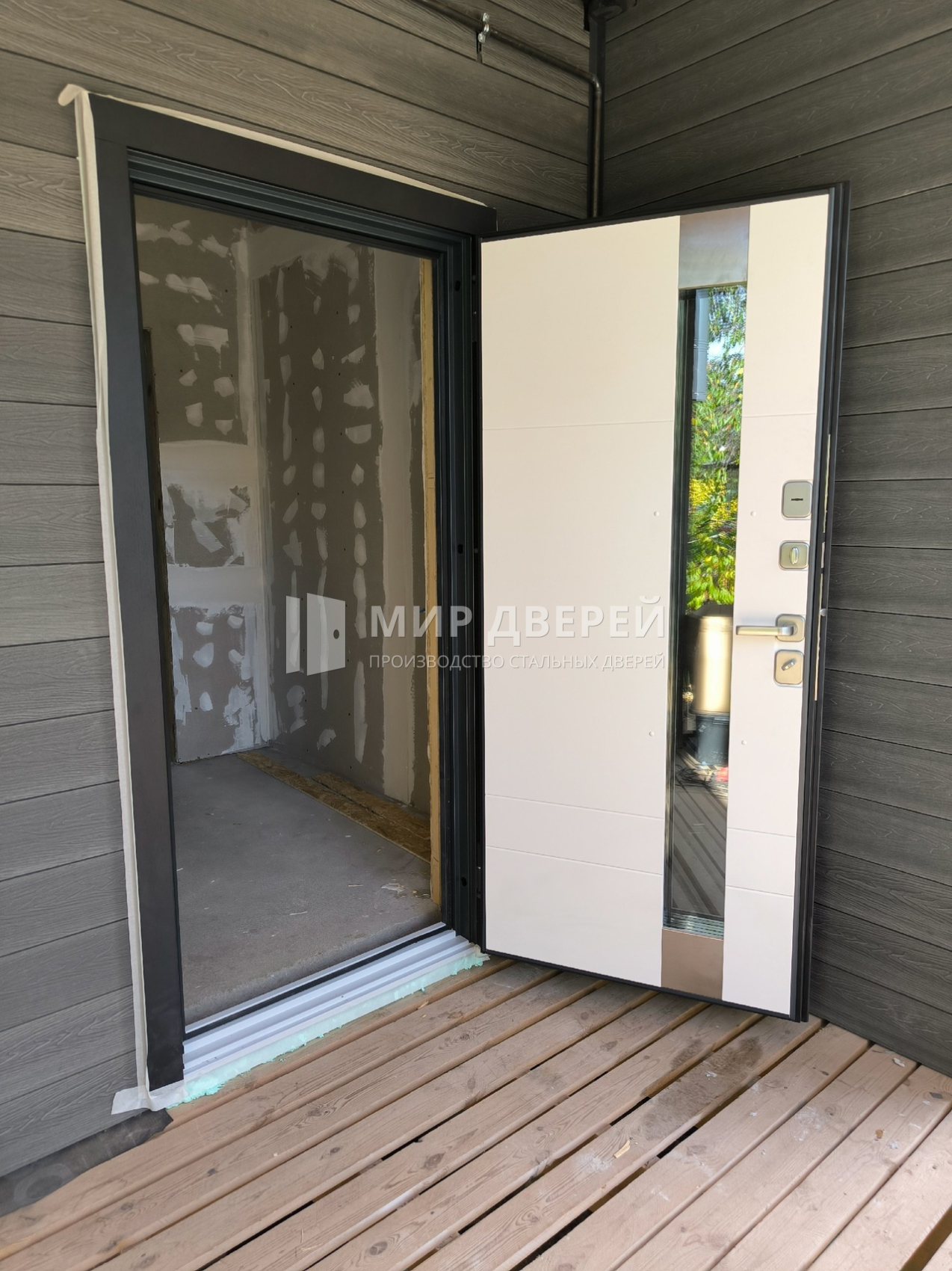 Наружная дверь со светлыми МДФ накладками №46, идеально подходящая для установки в частных домах, квартирах или офисах, предлагает элегантный дизайн в сочетании с высокой функциональностью. Внешняя и внутренняя отделка из МДФ с ПВХ покрытием в светлых тонах, включая белый, не только красиво смотрится, но и устойчива к внешним воздействиям, что делает дверь долговечной и легкой в уходе. Декоративное зеркало не только украшает дверь, но и приносит практическую пользу, визуально расширяя пространство.